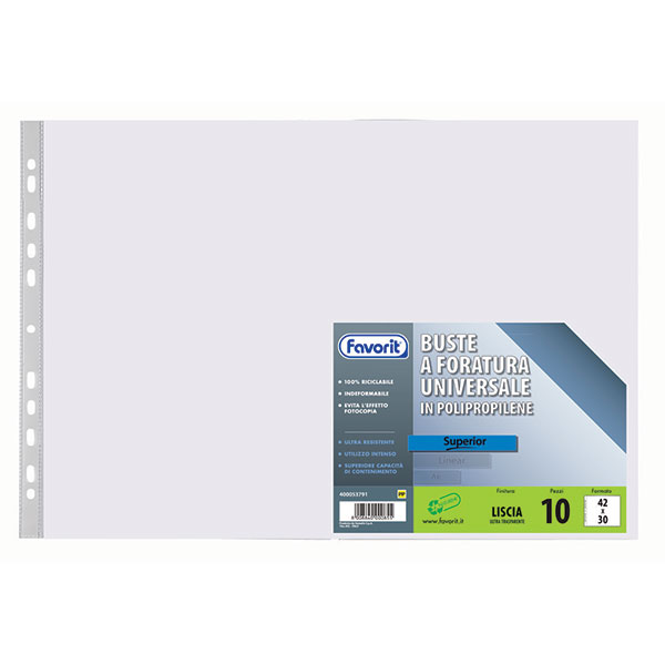 BUSTE A FORATURA UNIVERSALE FORMATO INTERNO 42X30 ALBUM Realizzate in polipropilene di alta qualità. Finitura liscia e perfetta trasparenza. Spessore SUPERIOR. Extra protezione per utilizzo quotidiano.