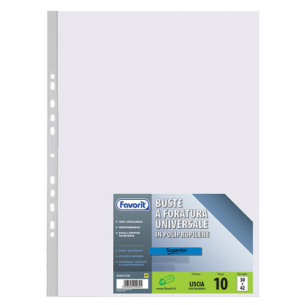 BUSTE A FORATURA UNIVERSALE FORMATO INTERNO 30X42 LIBRO Realizzate in polipropilene di alta qualità. Finitura liscia e perfetta trasparenza. Spessore SUPERIOR. Extra protezione per utilizzo quotidiano.
