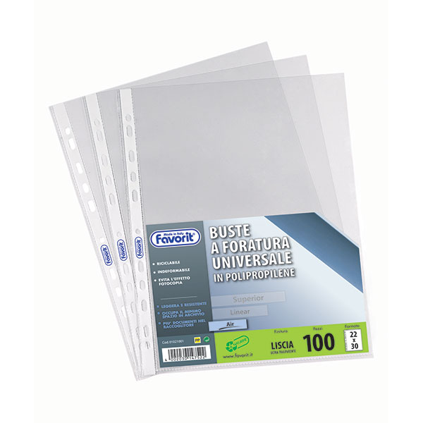 BUSTE A FORATURA UNIVERSALE FORMATO INTERNO 22X30 Realizzate in polipropilene di alta qualità. Finitura liscia e perfetta trasparenza. Spessore AIR. Leggera ma tenace. Scatole da 10 confezioni.