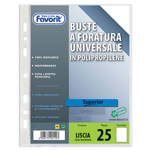 BUSTE A FORATURA UNIVERSALE FORMATO INTERNO 25X35 Realizzate in polipropilene di alta qualità. Finitura liscia e perfetta trasparenza. Spessore SUPERIOR. Extra protezione per utilizzo quotidiano. Scatole da 10 confezioni.