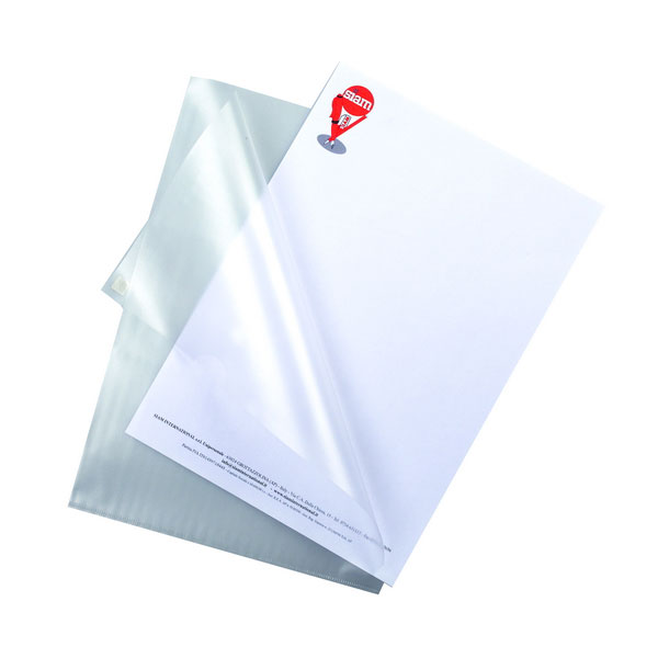 BUSTE CON APERTURA A "L" Confezione da 50 cartelline aperte sui due lati. Formato interno 22x30. Realizzate in polipropilene spessore 10/100. Finitura buccia d'arancia. Scatole da 20 confezioni.