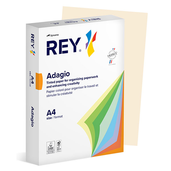 REY ADAGIO. Cartiera "International Paper". Carta colorata in formato A4, colore avorio, 80 grammi. Garantita per stampanti ad inchiostro e laser. Certificazioni "EU Ecolabel" e "PEFC".