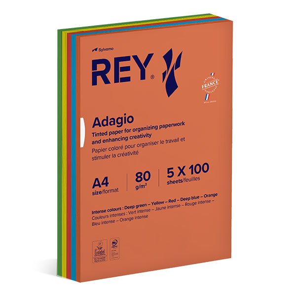 Carta colorata in formato A4, 80 grammi, assortita nei colori intensi (100fg x giallo intenso, 100fg x rosso intenso, 100fg x verde intenso, 100fg x azzurro intenso, 100fg x arancio intenso). Garantita per stampanti ad inchiostro e laser. Certificazioni "EU Ecolabel" e "PEFC".